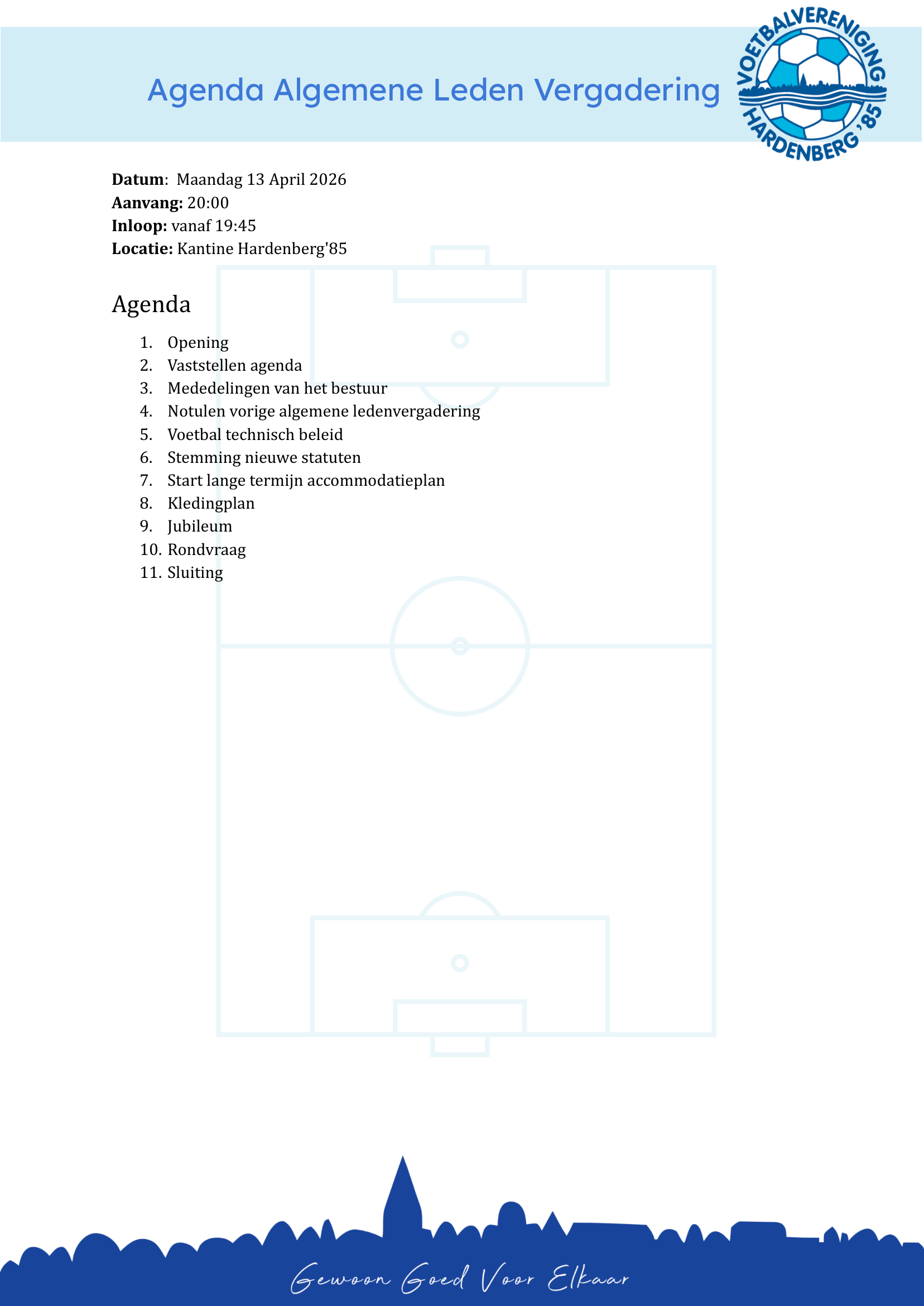 Het bestuur van v.v. Hardenberg’85 nodigt leden, donateurs en vrijwilligers uit tot het bijwonen van de Algemene Ledenvergadering op maandag 13 april 2026.